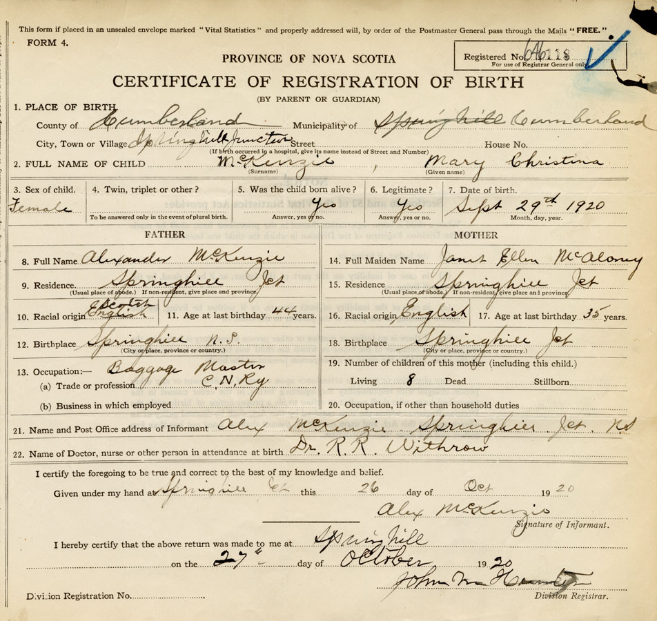 21. Name and Post Office address of Informant Alex McKenzie Springhill Jct. N.S.