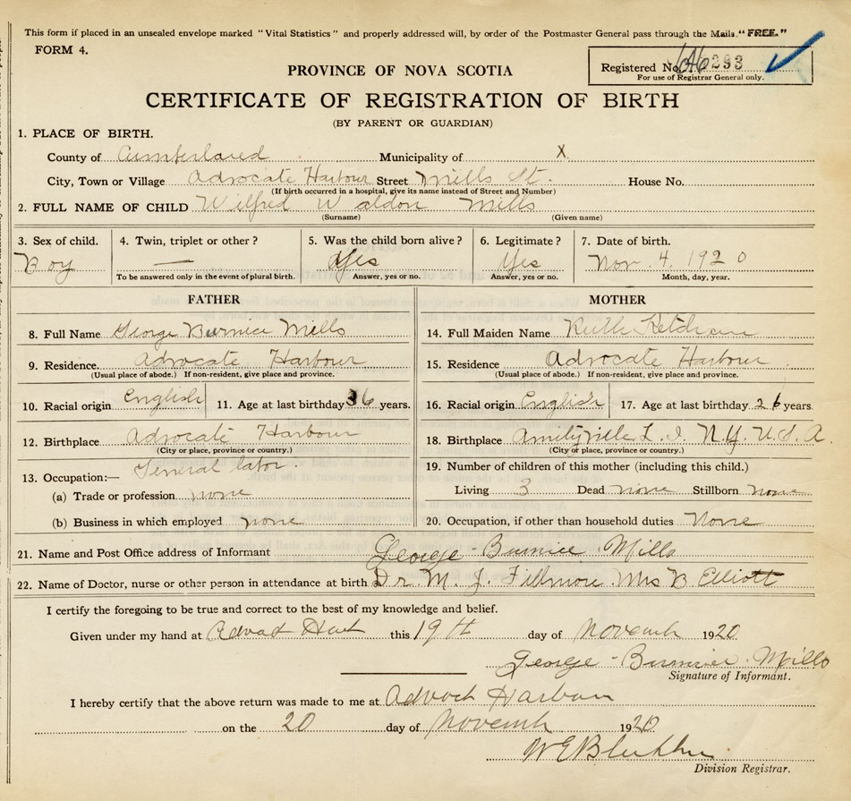 21. Name and Post Office address of Informant George Burness Mills Advocate Harbour