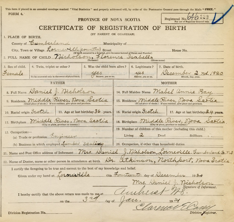 21. Name and Post Office address of Informant Mrs. Daniel J. Nicholson Lorneville, Cumberland Co. N.S.