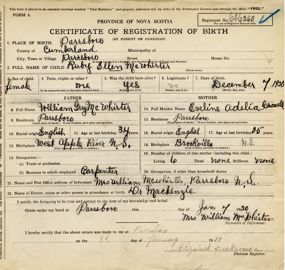 21. Name and Post Office address of Informant Mrs. William McWhirter Parrsboro