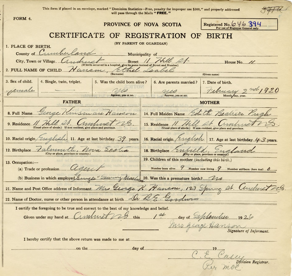 21. Name and Post Office address of Informant Mrs. George K. Hanson 123 Spring St. Amherst Nova Scotia