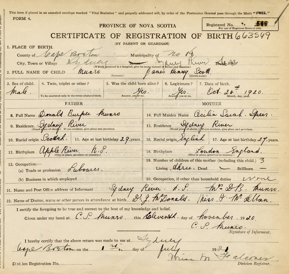 21. Name and Post Office address of Informant Mr. D.B. Munro Sydney River
