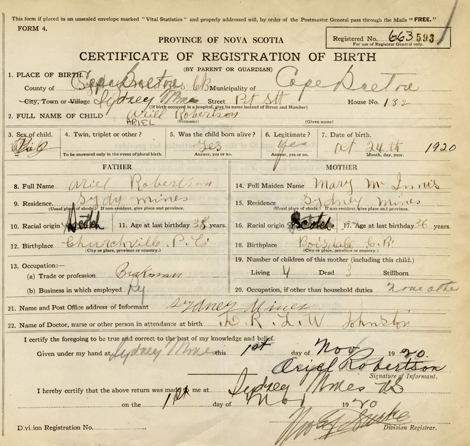 21. Name and Post Office address of Informant Ariel Robertson Sydney Mines