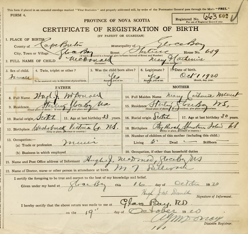 21. Name and Post Office address of Informant Hugh J. McDonald Glace Bay
