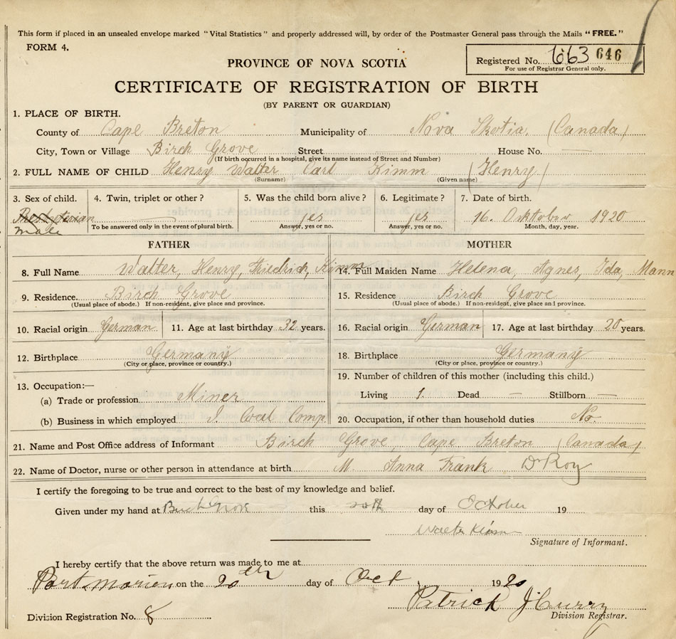 21. Name and Post Office address of Informant Walter Kimm Birch Grove, Cape Breton, Canada