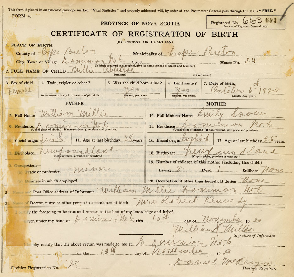 21. Name and Post Office address of Informant William Millie Dominion No. 6