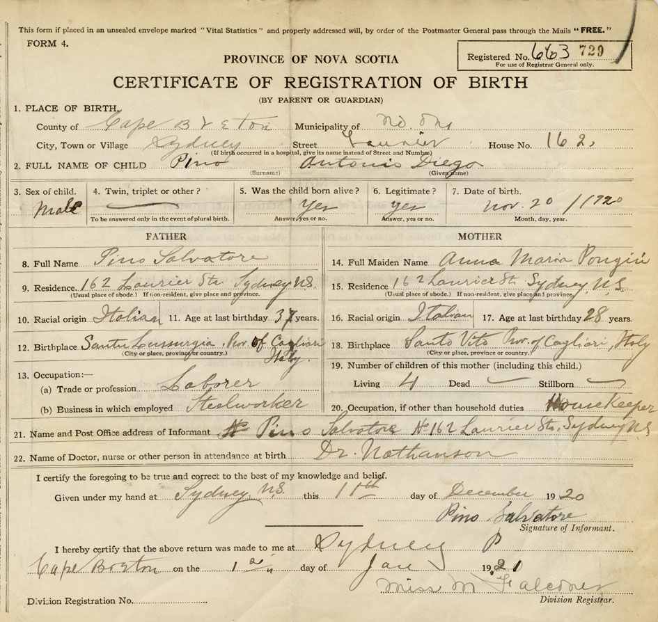 21. Name and Post Office address of Informant Pino Salvatore No.162 Laurier St., Sydney