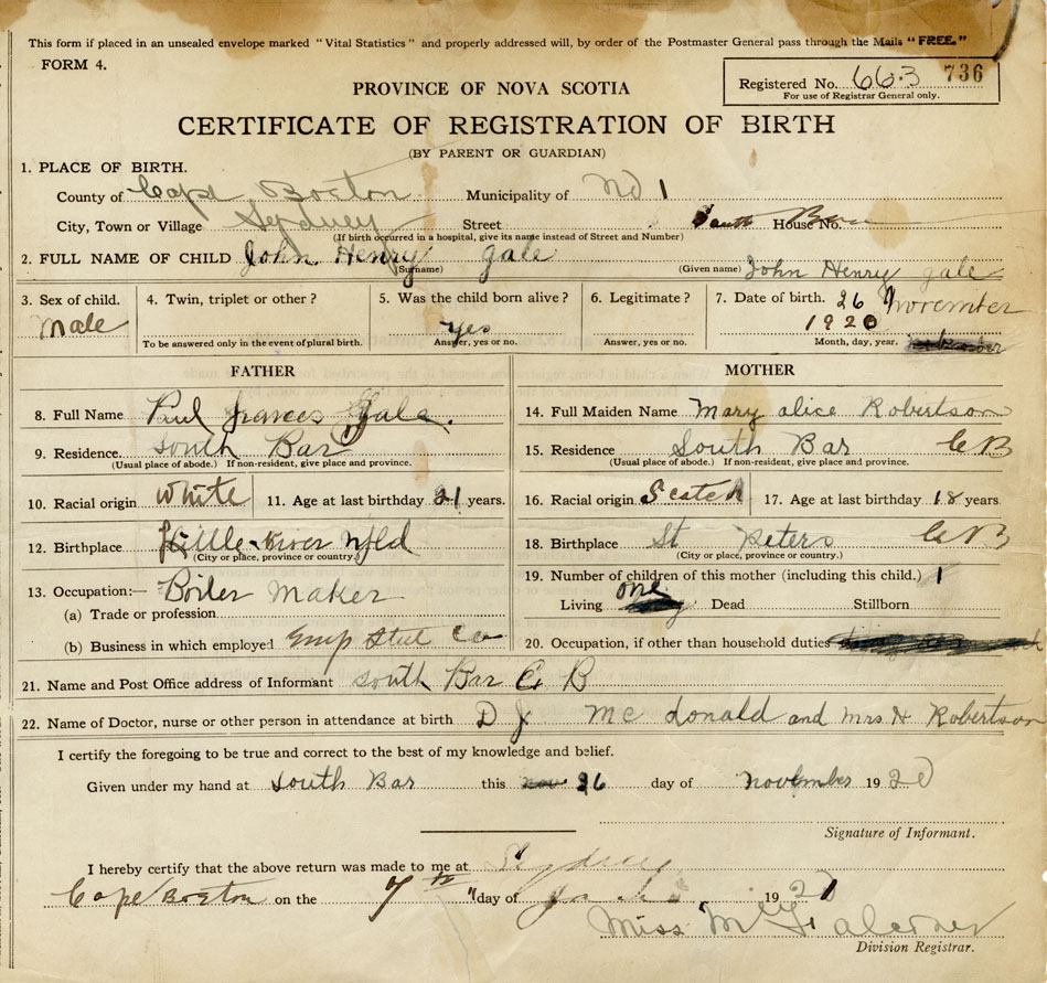 2. FULL NAME OF CHILD Gale, John Henry