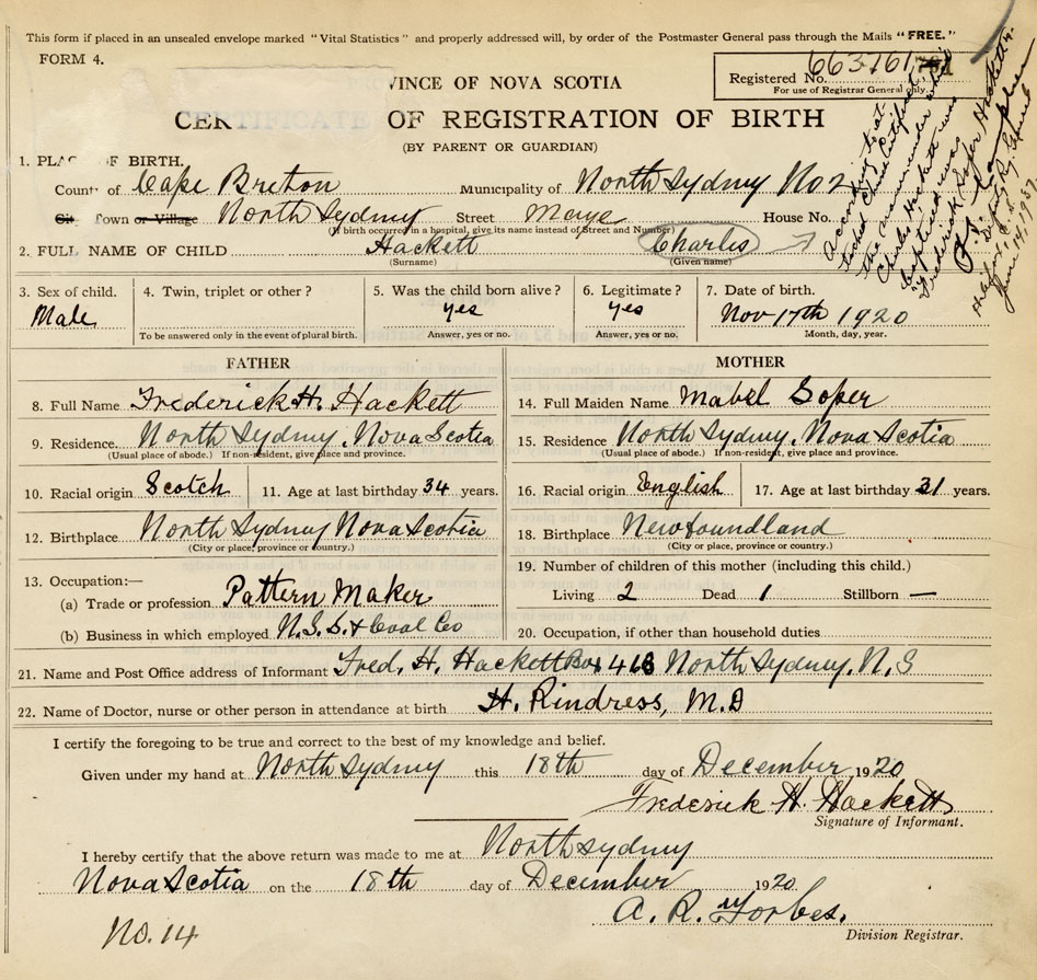 21. Name and Post Office address of Informant Fred. H. Hackett Box 468, North Sydney