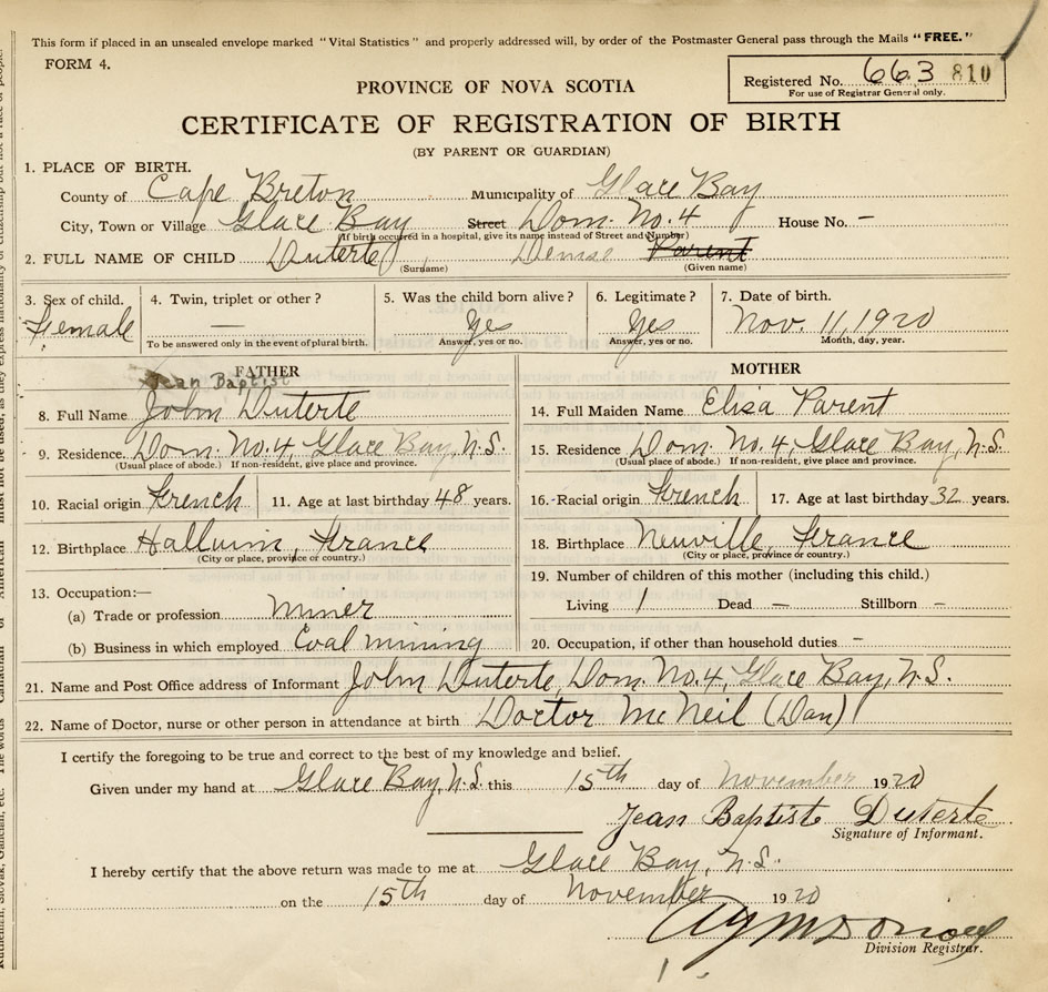 21. Name and Post Office address of Informant John Duterte Dom. No.4, Glace Bay