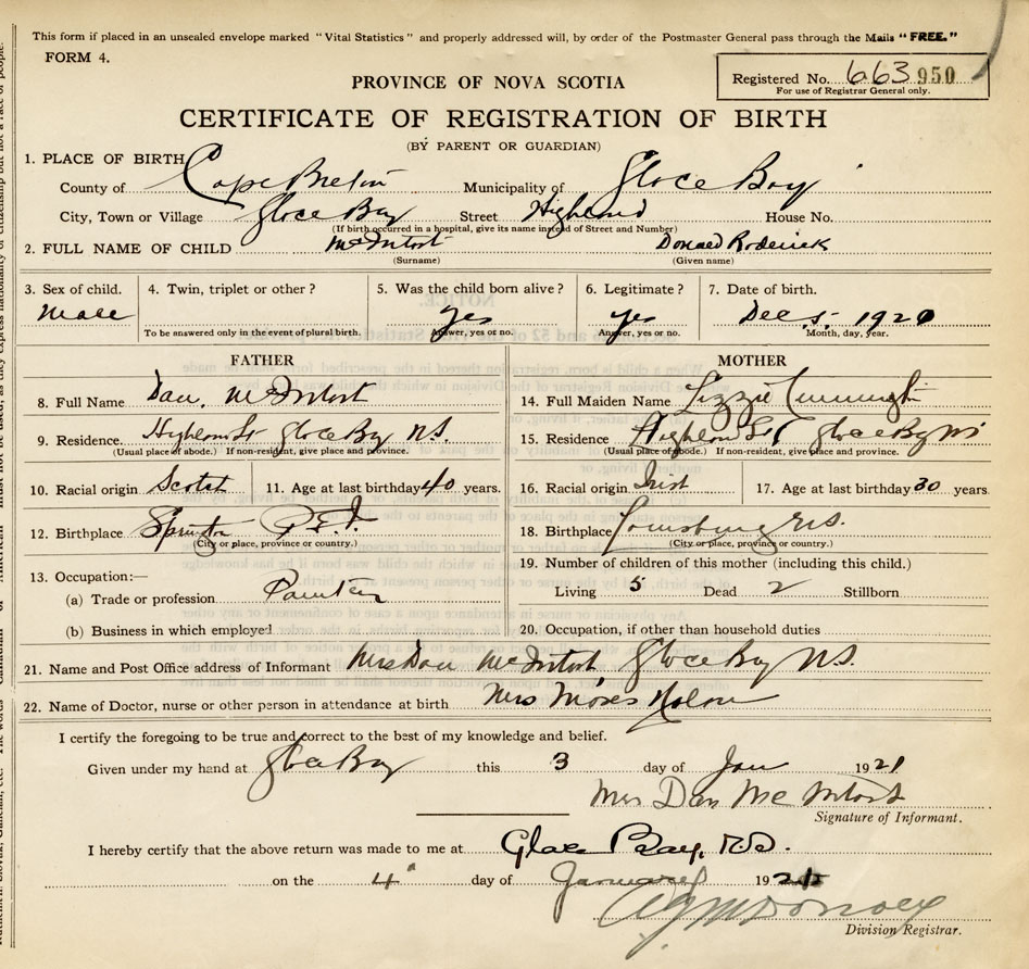 21. Name and Post Office address of Informant Mrs. Dan McIntosh, Glace Bay N.S.