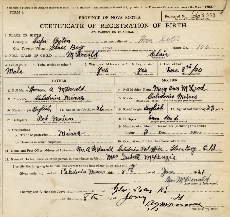 21. Name and Post Office address of Informant Nor. A. McDonald Caledonia Post Office, Glace Bay