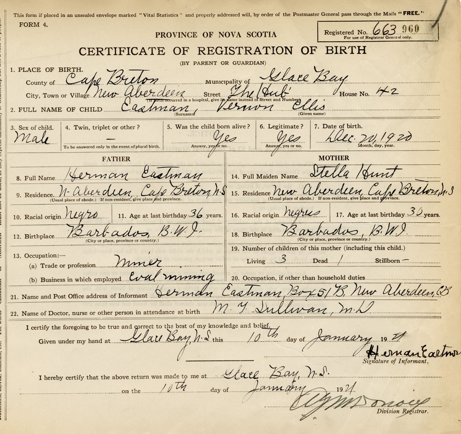 21. Name and Post Office address of Informant Herman Eastman Box 51 B, New Aberdeen, C. B.