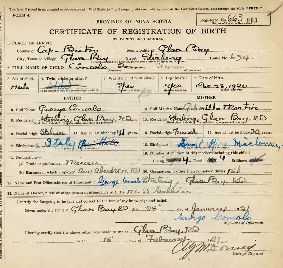 21. Name and Post Office address of Informant George Consolo Sterling, Glace Bay