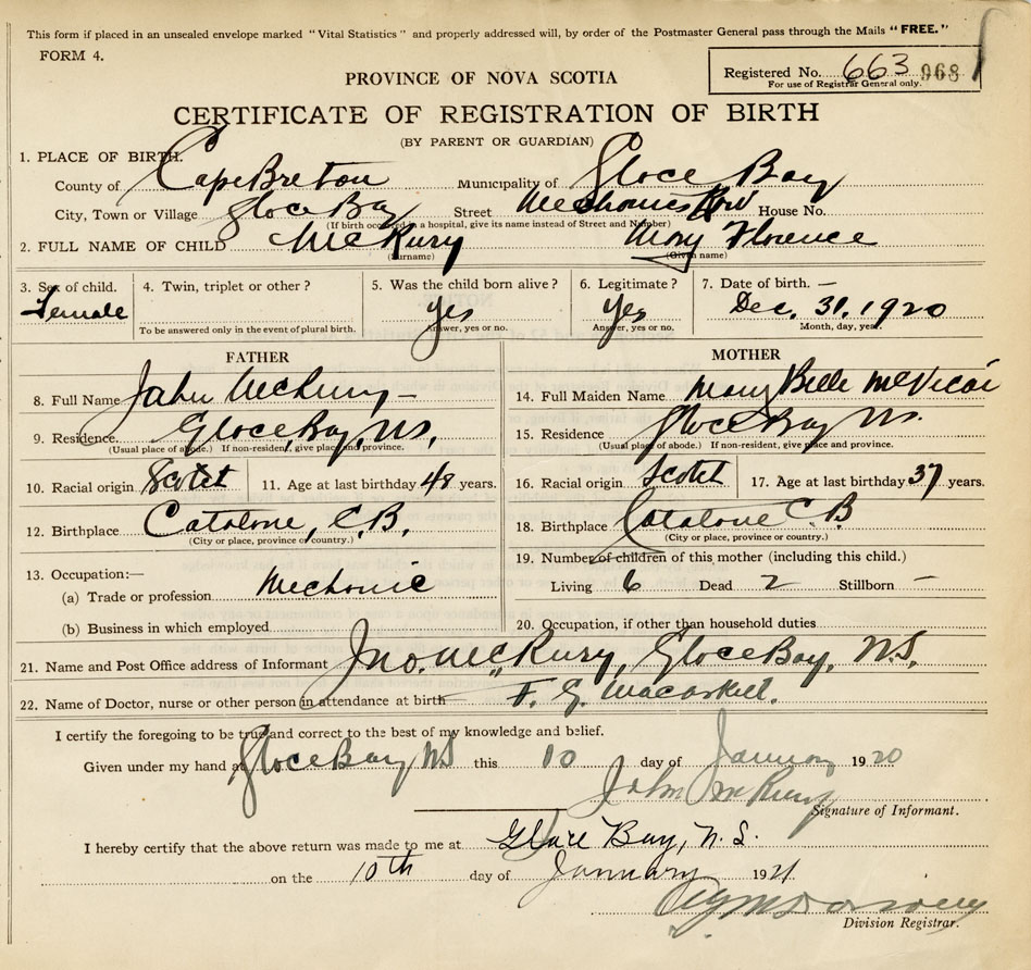 21. Name and Post Office address of Informant Jno. McRury Glace Bay