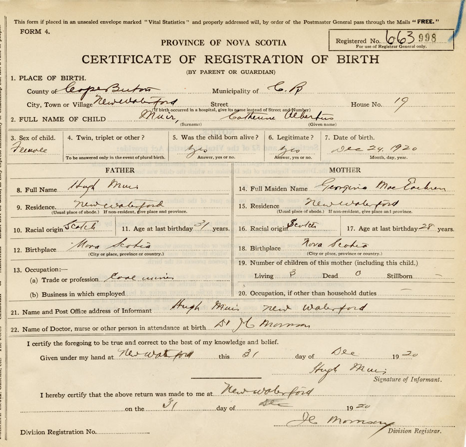 21. Name and Post Office address of Informant Hugh Muir New Waterford, Cape Breton Co.
