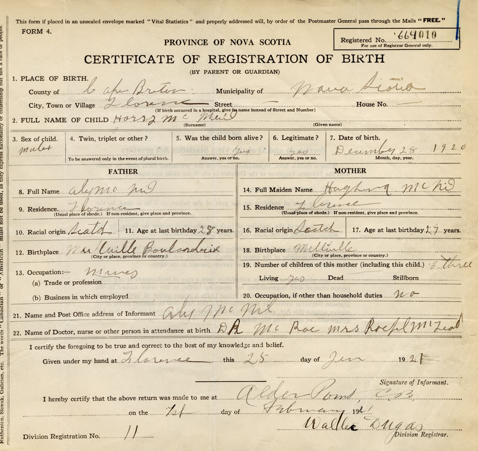22. Name of Doctor, nurse or other person in attendance at birth Dr. McRae, Mrs. Raefil McLeod