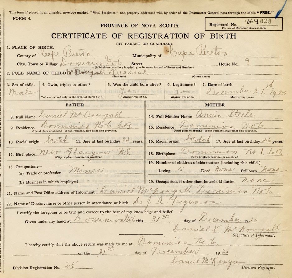 21. Name and Post Office address of Informant Daniel McDougall Dominion No. 6