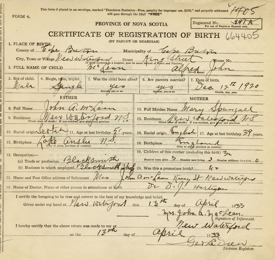 21. Name and Post Office address of Informant Mrs. John A. McLean King St., New Waterford