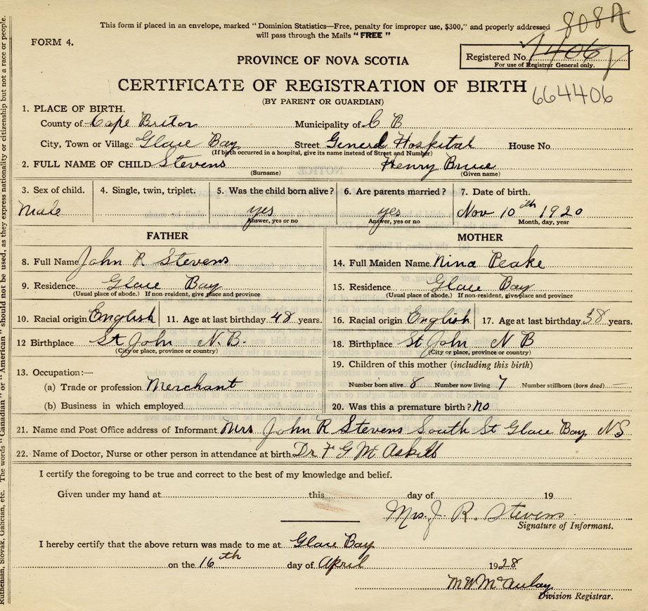 21. Name and Post Office address of Informant Mrs. John R. Stevens South Street, Glace Bay