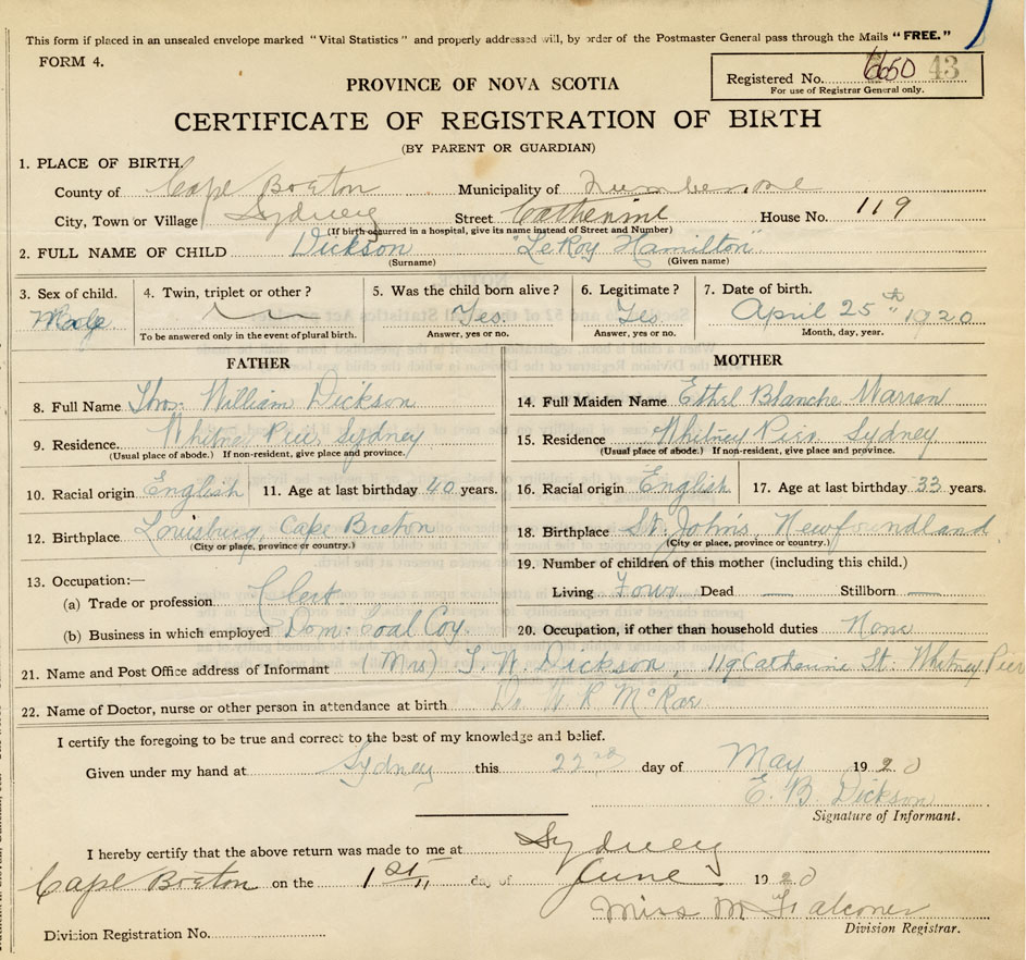 21. Name and Post Office address of Informant Mrs. T.W. Dickson 119 Catherine St., Whitney Pier,