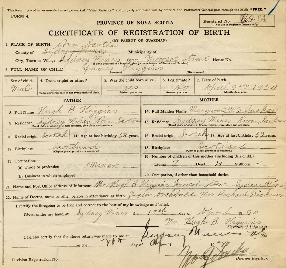 21. Name and Post Office address of Informant Mrs. Hugh B. Higgins Forrest Street, Sydney Mines