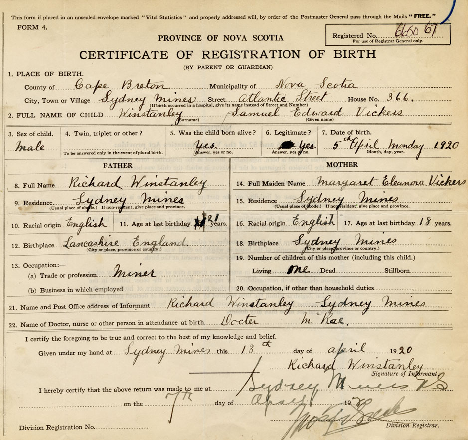 21. Name and Post Office address of Informant Richard Winstanley Sydney Mines