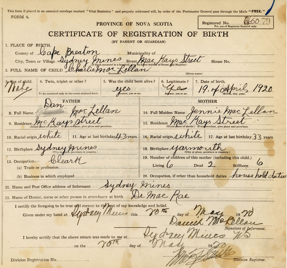 21. Name and Post Office address of Informant Daniel MacLellan Sydney Mines NS