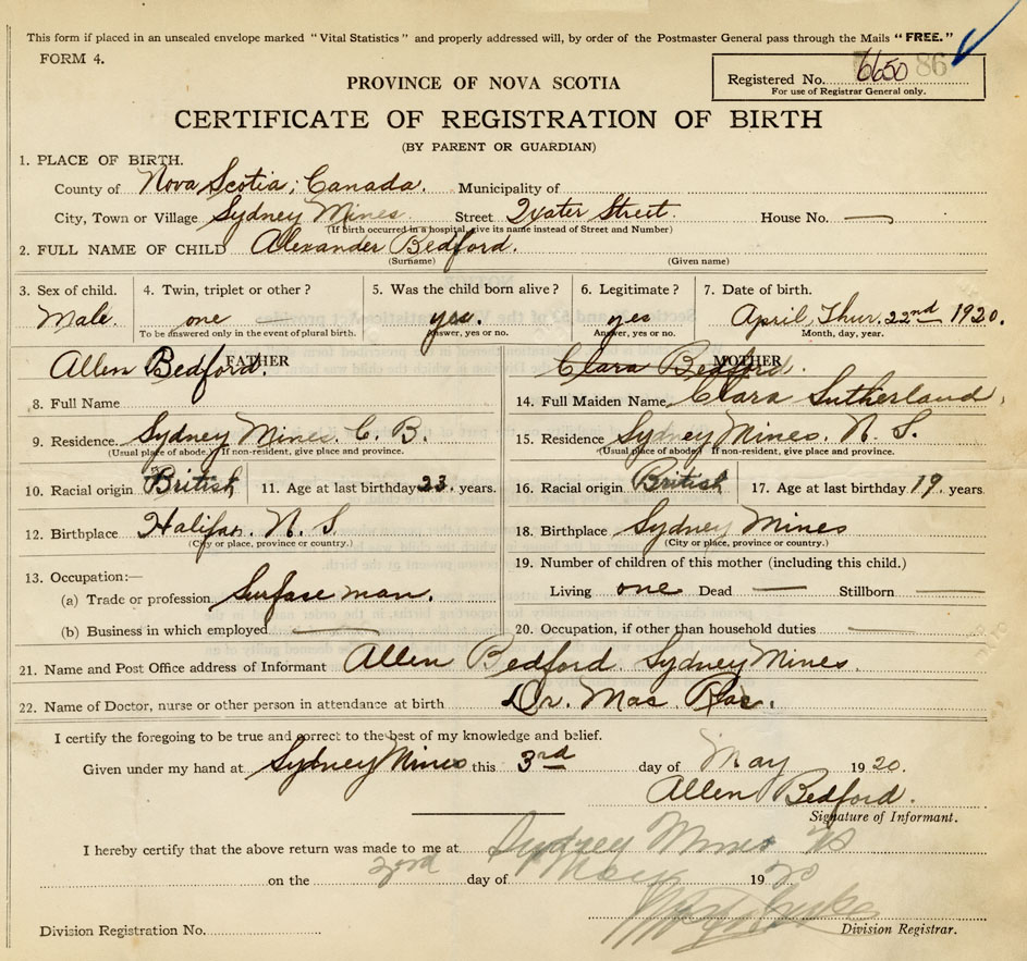 21. Name and Post Office address of Informant Allen Bedford Sydney Mines