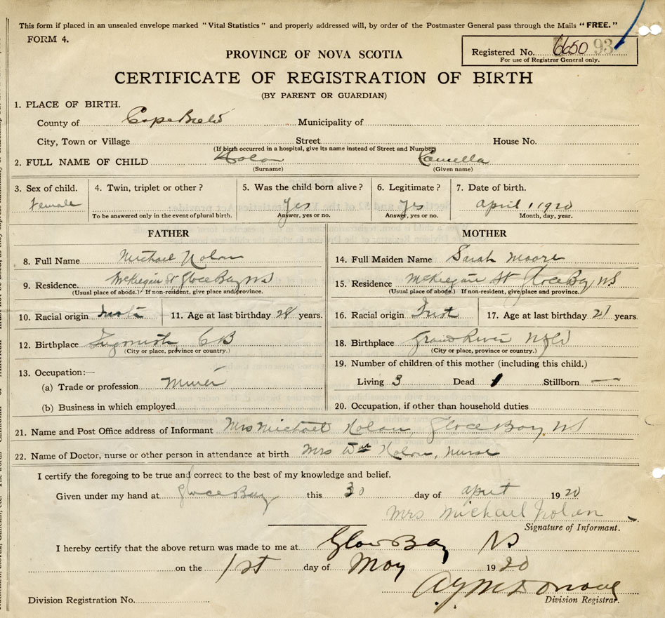 21. Name and Post Office address of Informant Mrs. Michael Nolan Glace Bay