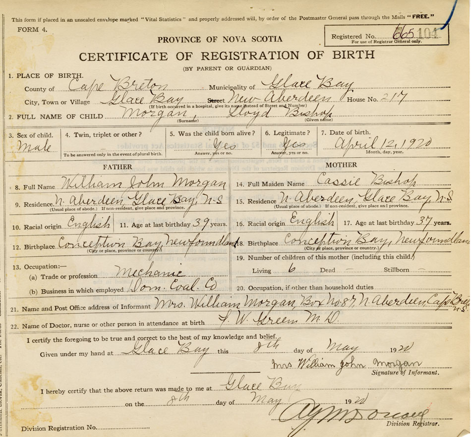 21. Name and Post Office address of Informant Mrs. William Morgan Box No.87, N. Aberdeen, Cape Breton