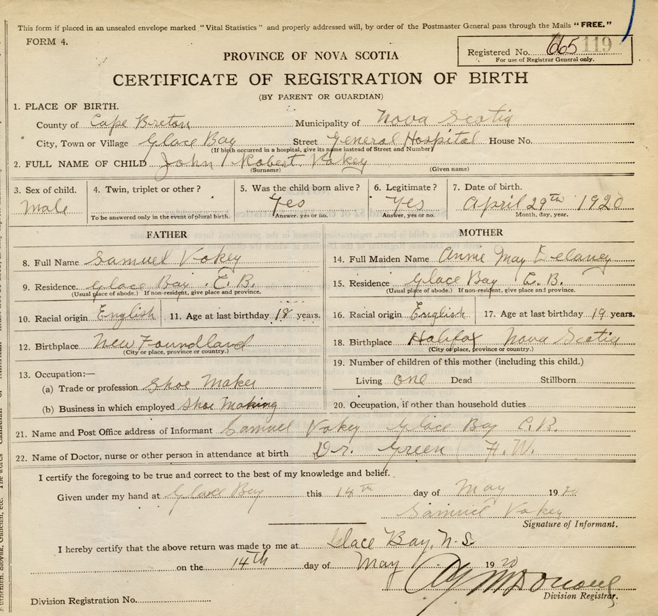 21. Name and Post Office address of Informant Samuel Vokey Glace Bay