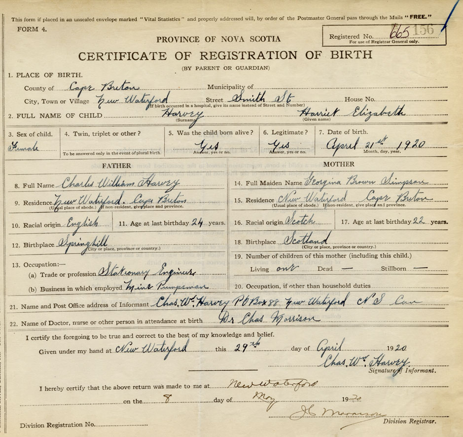 21. Name and Post Office address of Informant Chas. Wm. Harvey PO Box 88, New Waterford Can.