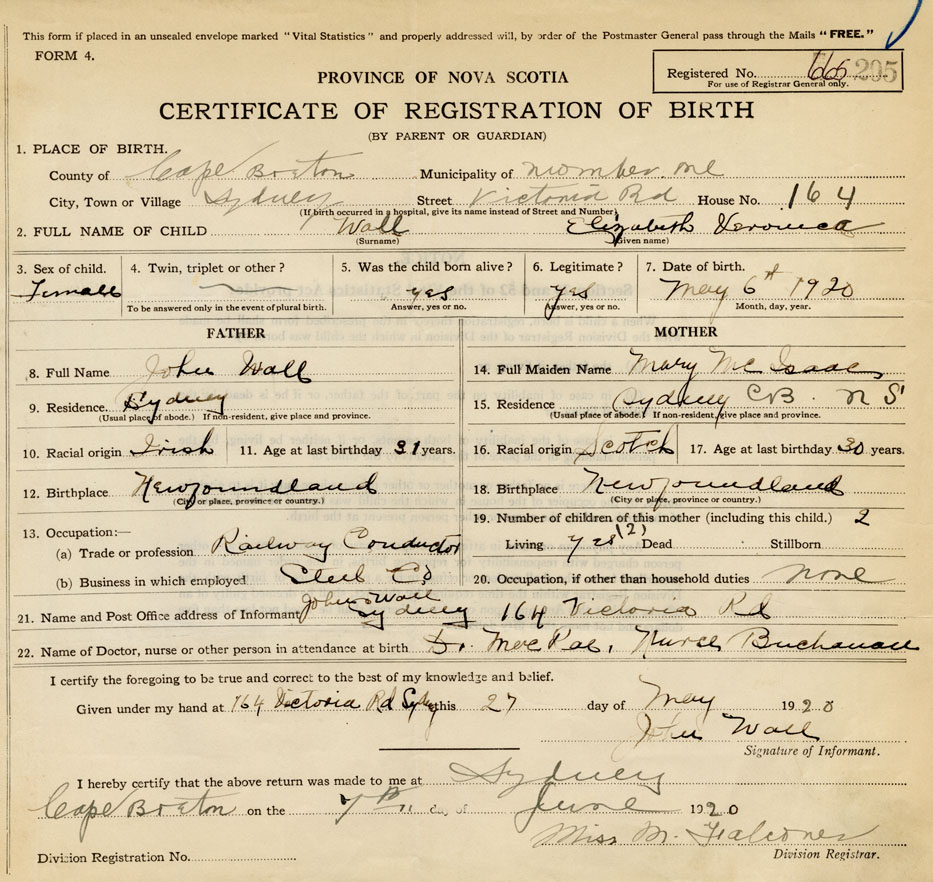 22. Name of Doctor, nurse or other person in attendance at birth Dr. MacRae, Nurse Buchanan