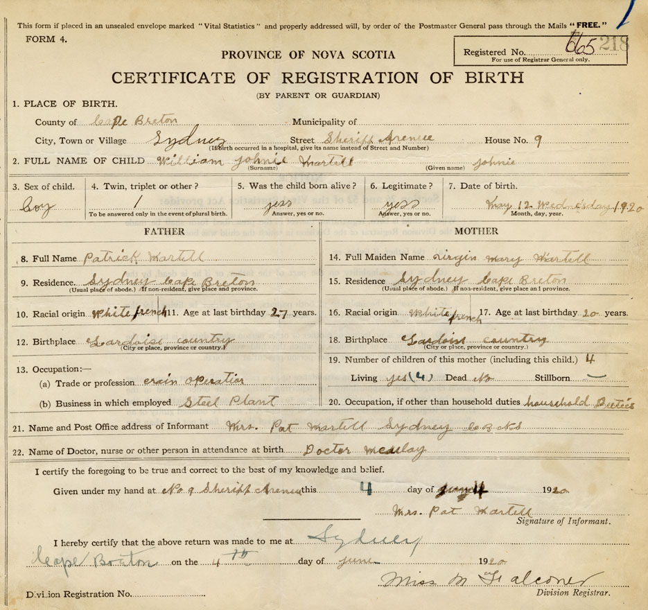 21. Name and Post Office address of Informant Mrs. Pat Martell Sydney N.S.