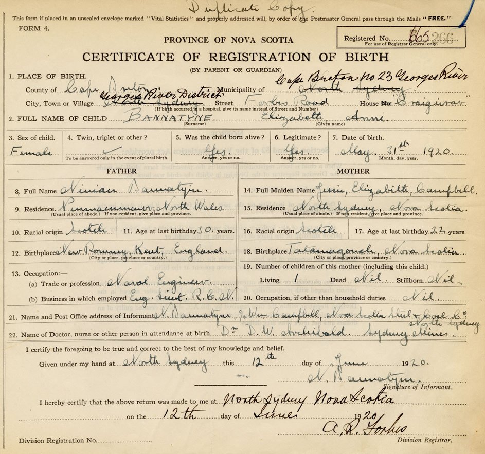 21. Name and Post Office address of Informant N. Bannatyne c/o Wm. Campbell Nova Scotia Steel & Coal Co, North Sydney