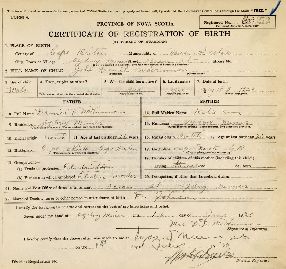21. Name and Post Office address of Informant Mrs. D.D. McKinnon Ocean St., Sydney Mines