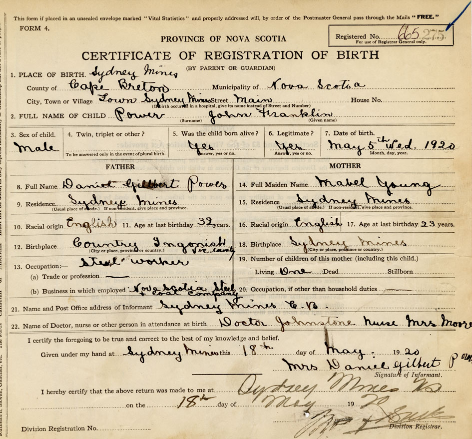 21. Name and Post Office address of Informant Mrs. Daniel Gilbert Power Sydney Mines