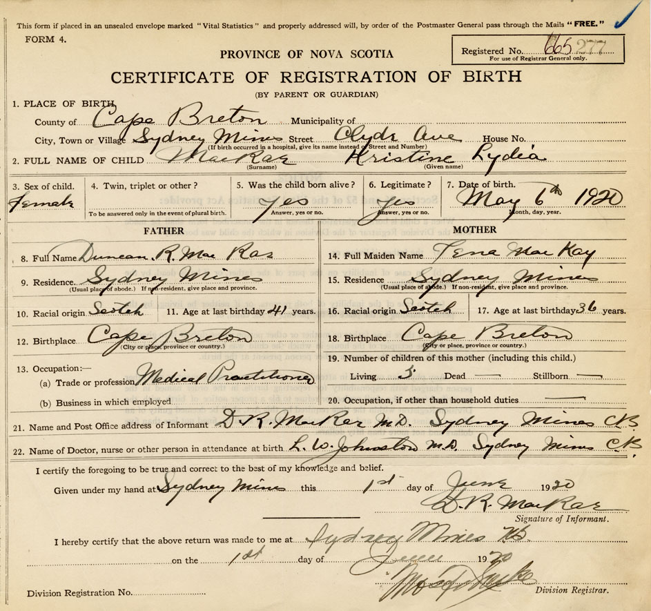 21. Name and Post Office address of Informant D. R. MacRae MD. Sydney Mines C.B.