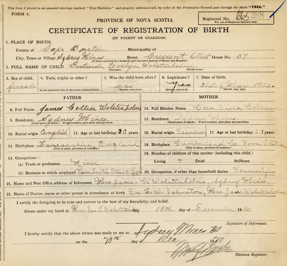21. Name and Post Office address of Informant Mrs. James C. Wolstenholme Sydney Mines