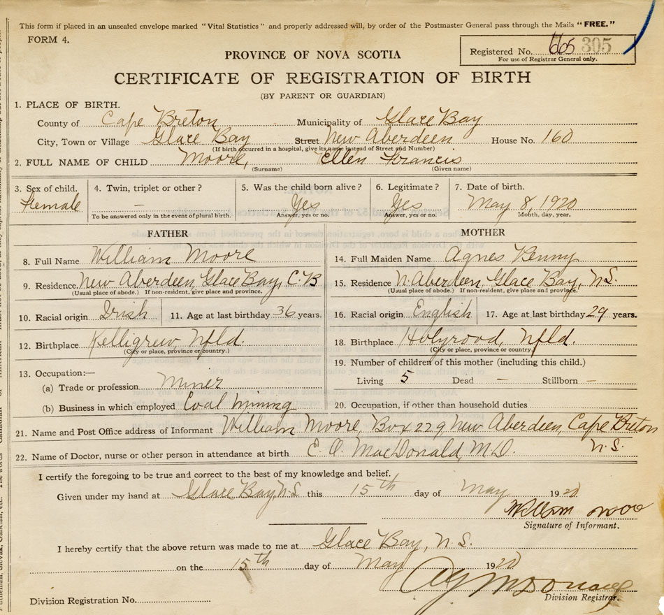21. Name and Post Office address of Informant William Moore Box 229, New Aberdeen, Cape Breton