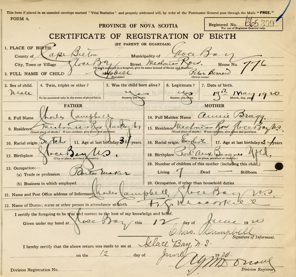21. Name and Post Office address of Informant Charles Campbell Glace Bay