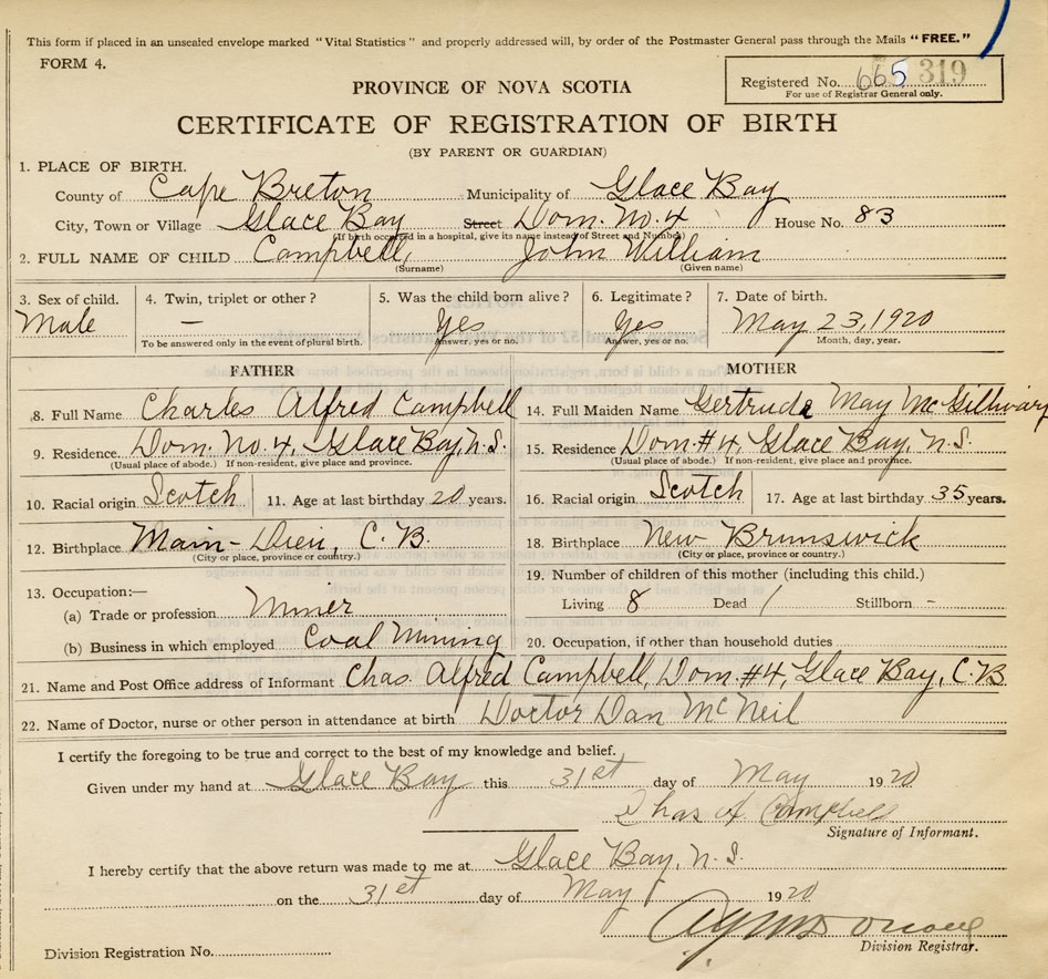 21. Name and Post Office address of Informant Chas. Alfred Campbel Dom. #4, Glace Bay