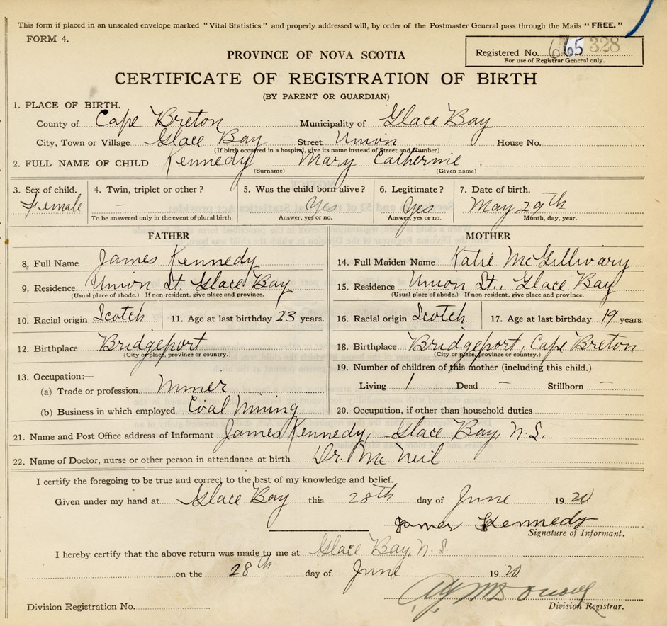 21. Name and Post Office address of Informant James Kennedy Glace Bay