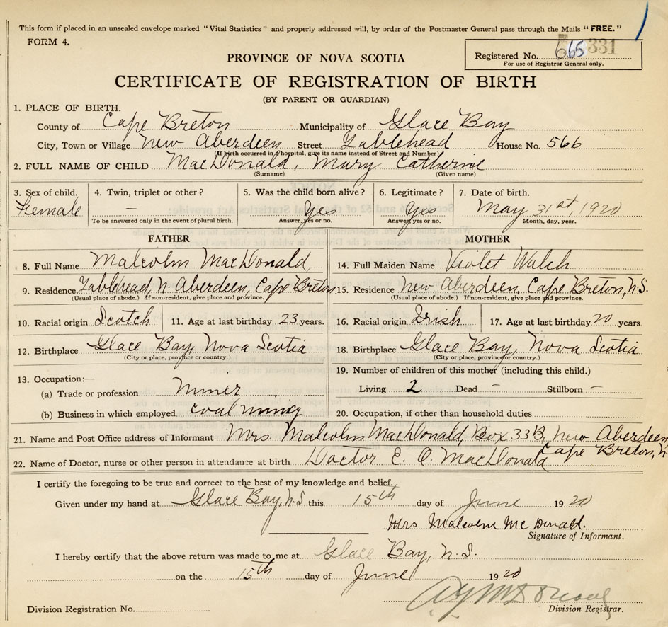 21. Name and Post Office address of Informant Mrs. Malcolm MacDonald Box 33B, New Aberdeen, Cape Breton