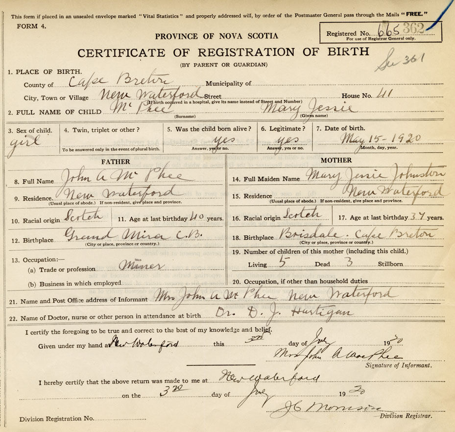 21. Name and Post Office address of Informant Mrs John A McPhee New Waterford