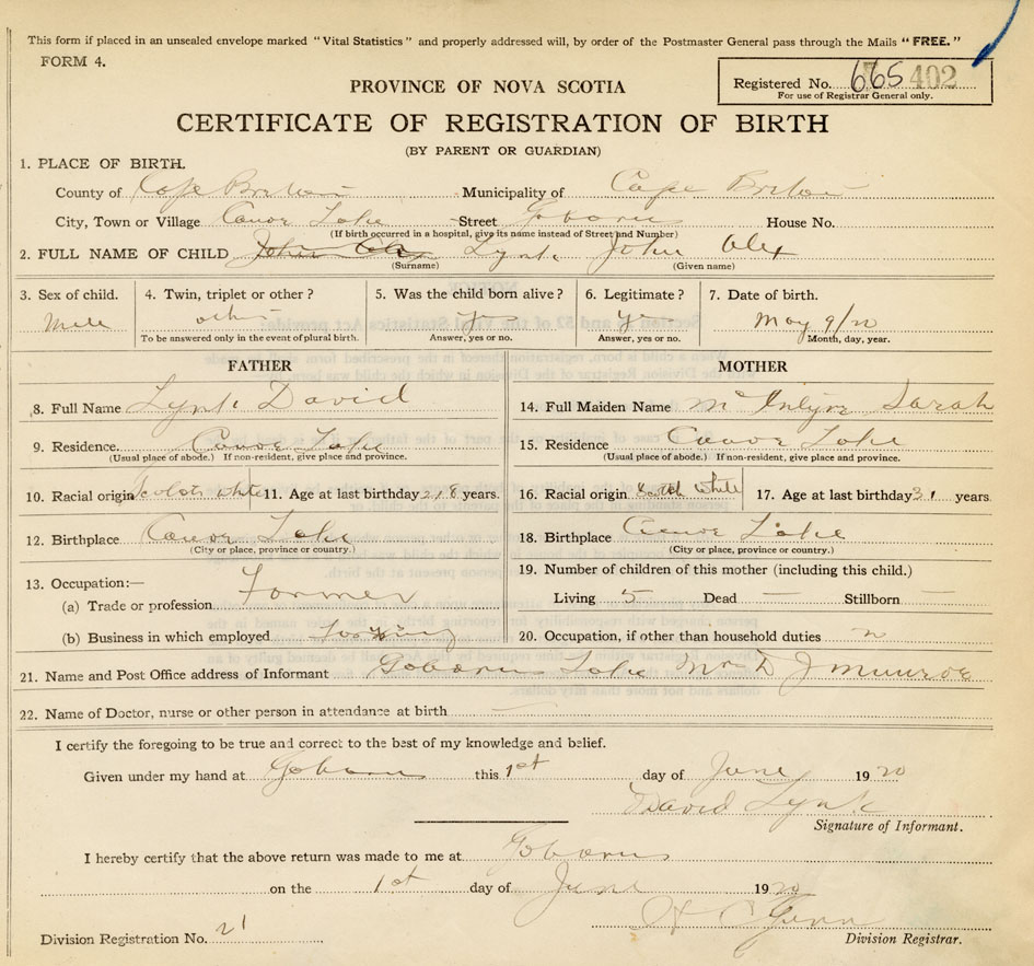 21. Name and Post Office address of Informant Mrs. D.J. Munroe Gabarus Lake