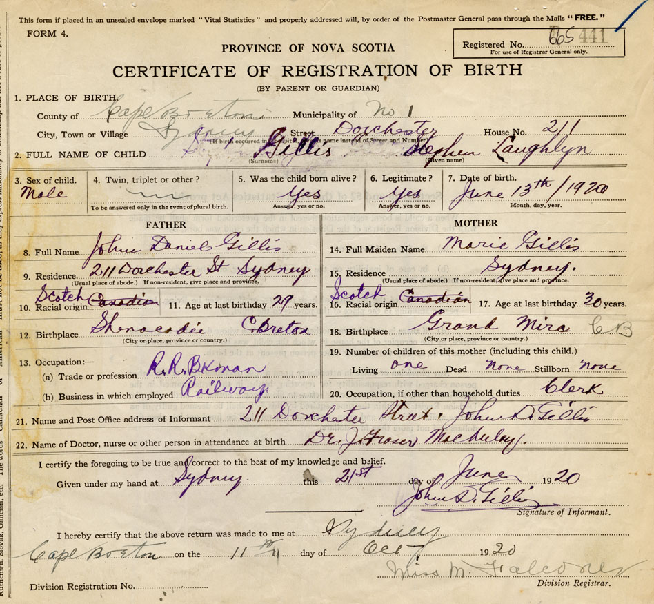 22. Name of Doctor, nurse or other person in attendance at birth Dr. J. Fraser MacAulay