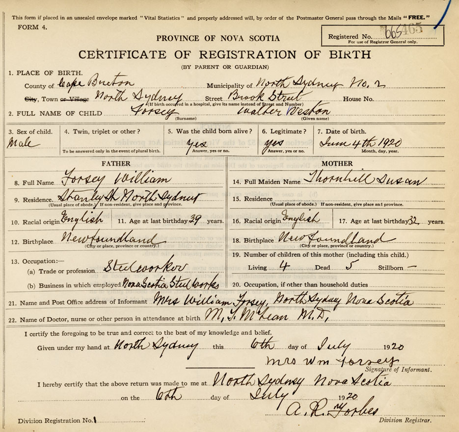 21. Name and Post Office address of Informant Mrs William Forsey North Sydney Nova Scotia