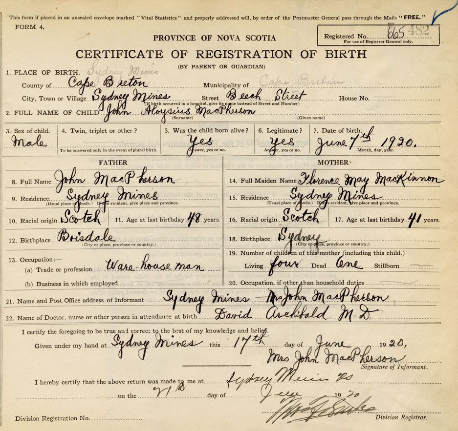 21. Name and Post Office address of Informant Mrs. John MacPherson Sydney Mines